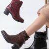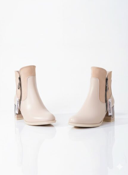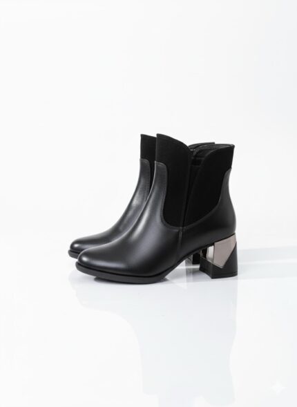 كعب هندسي مبتكر: يرتكز البوت على كعب عريض ومكتنز (Block Heel) يوفر ثباتاً وراحة استثنائية. يتميز الكعب بتفصيل هندسي مبتكر، حيث يغطى جزء منه بمادة لامعة (معدنية أو عاكسة) ليزيد من جاذبيته.