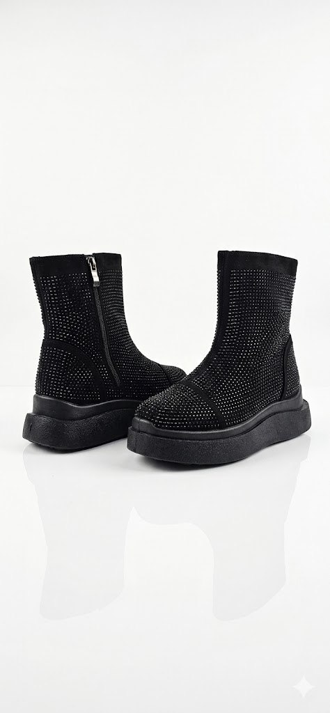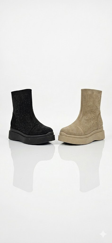 بوت نسائي مرصع بالفصوص اللامعة بنعل “بلاتفورم” عريض – لإطلالة كاجوال براقة