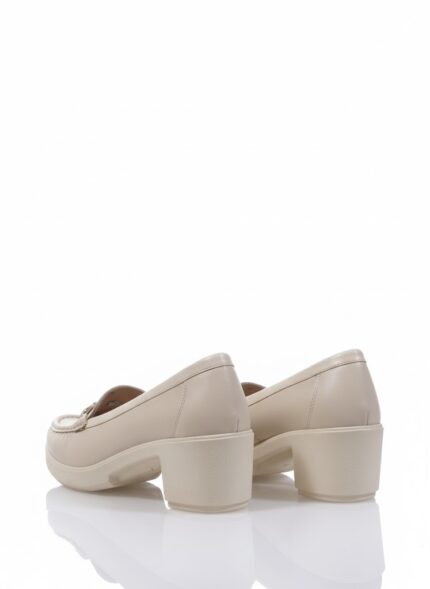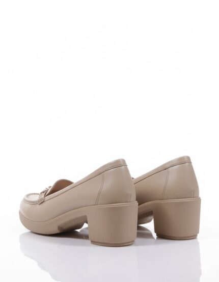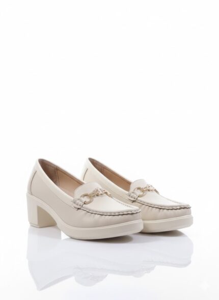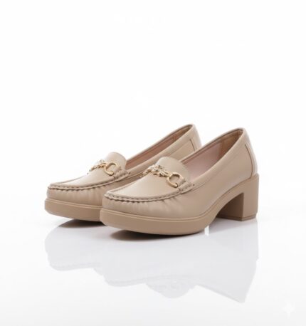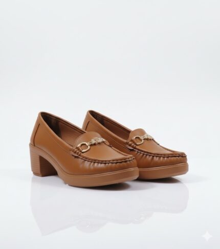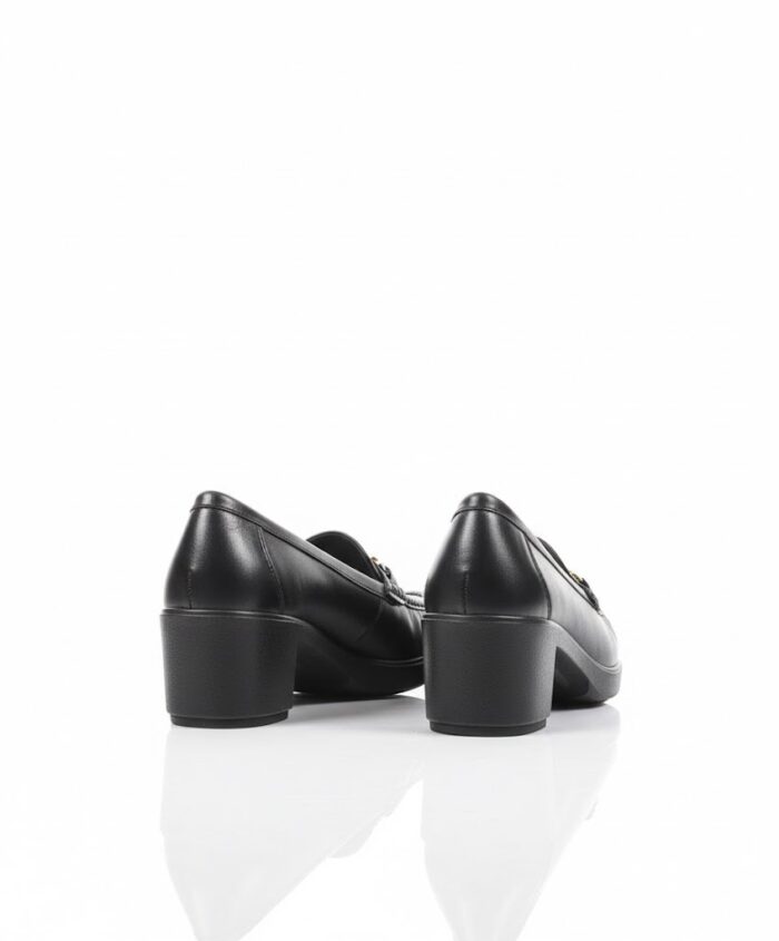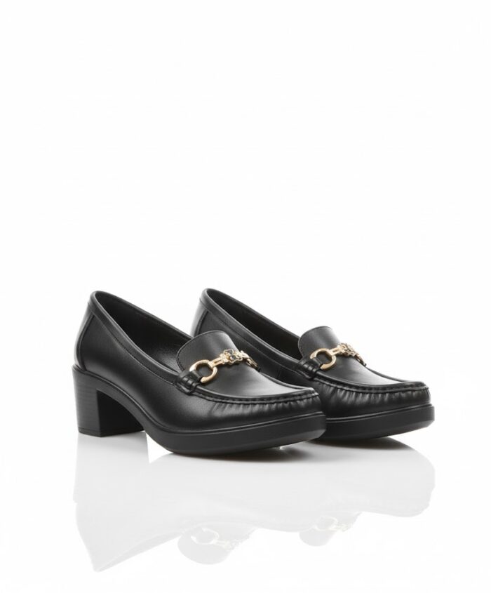 أناقة عملية وكلاسيكية. الحذاء ده بيجمع بين ستايل اللوفر العملي وكعب أنثوي عريض، وده بيخليه مناسب جداً للمرأة اللي بتبحث عن الأناقة والراحة في نفس الوقت. اللمسة المعدنية الفضية بتضيف له شكل شيك، وهو مثالي لإطلالة مكتبية أنيقة أو خروجة نهارية مريحة.