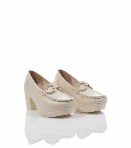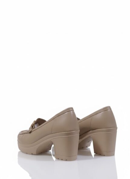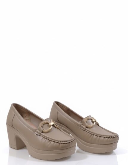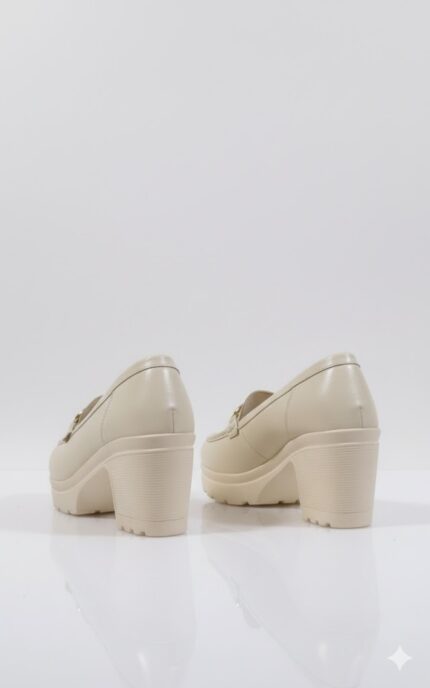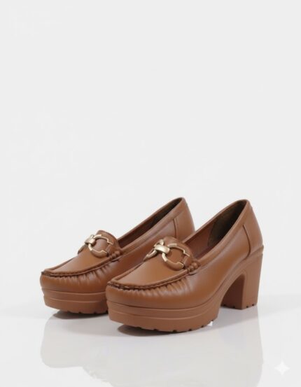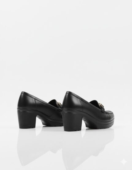 أناقة عملية وكلاسيكية. الحذاء ده بيجمع بين ستايل اللوفر العملي وكعب أنثوي عريض، وده بيخليه مناسب جداً للمرأة اللي بتبحث عن الأناقة والراحة في نفس الوقت. اللمسة المعدنية الفضية بتضيف له شكل شيك، وهو مثالي لإطلالة مكتبية أنيقة أو خروجة نهارية مريحة.