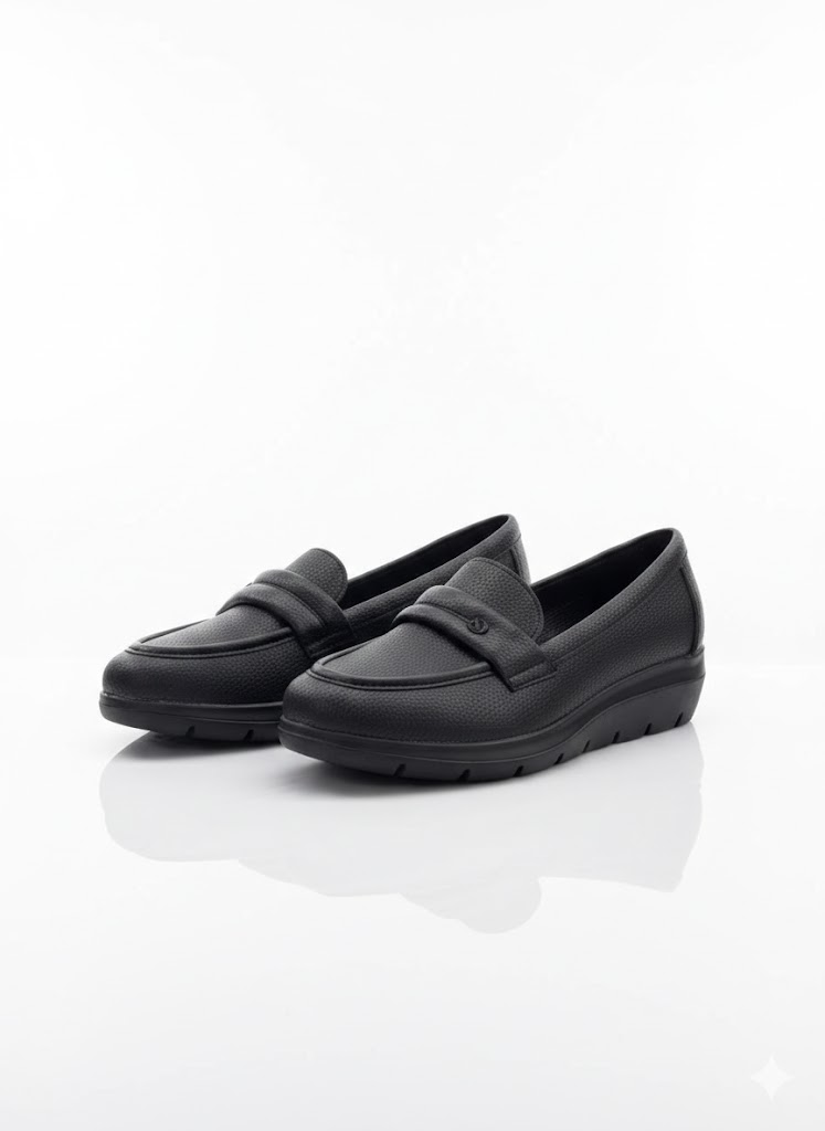 “الراحة التي تستحقها قدماكِ في حذاء واحد. صُمم هذا الحذاء الأسود ليكون رفيقك المثالي في مشاوير العمل والطلعات اليومية، بجلد منقوش بمسامات تسمح بالتهوية ونعل مرن ممتص للصدمات. تصميم ‘Loafer’ كلاسيكي يوفر لكِ سهولة في الارتداء مع ثبات تام، ليضمن لكِ خطوة واثقة ومريحة دون أي مجهود.”