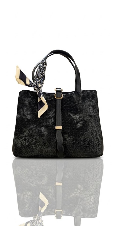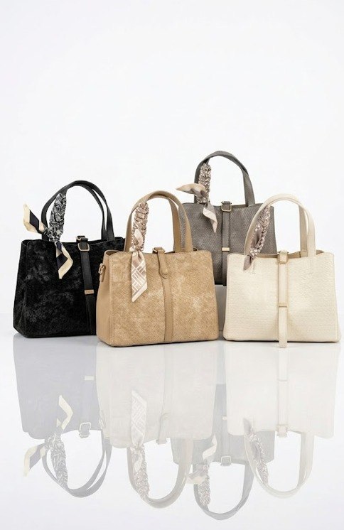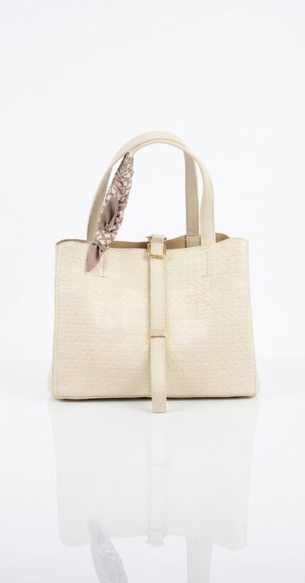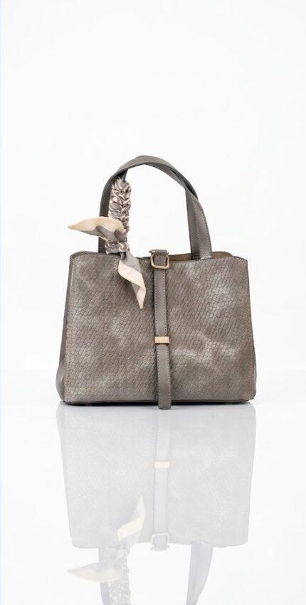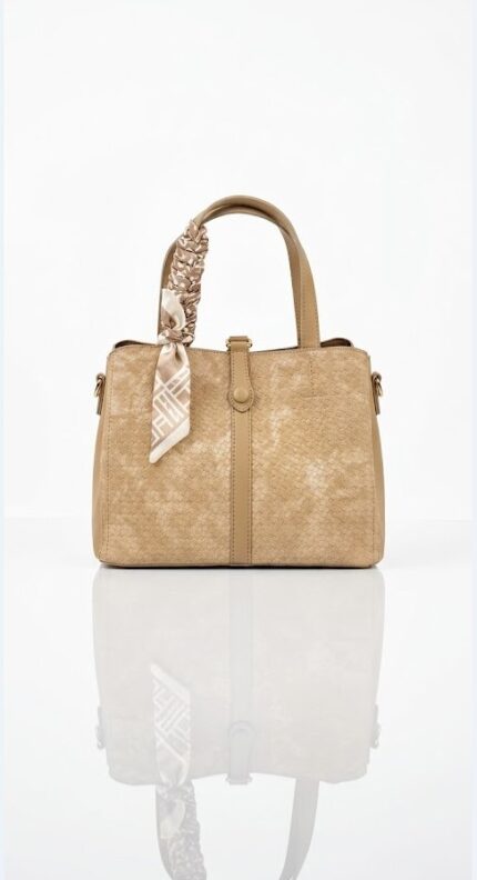 لمسة السكارف الساحرة: تأتي الشنطة مزينة بسكارف ستان بنقشات راقية ملفوف حول اليد، مما يعطيها مظهراً متجدداً ومميزاً جداً.