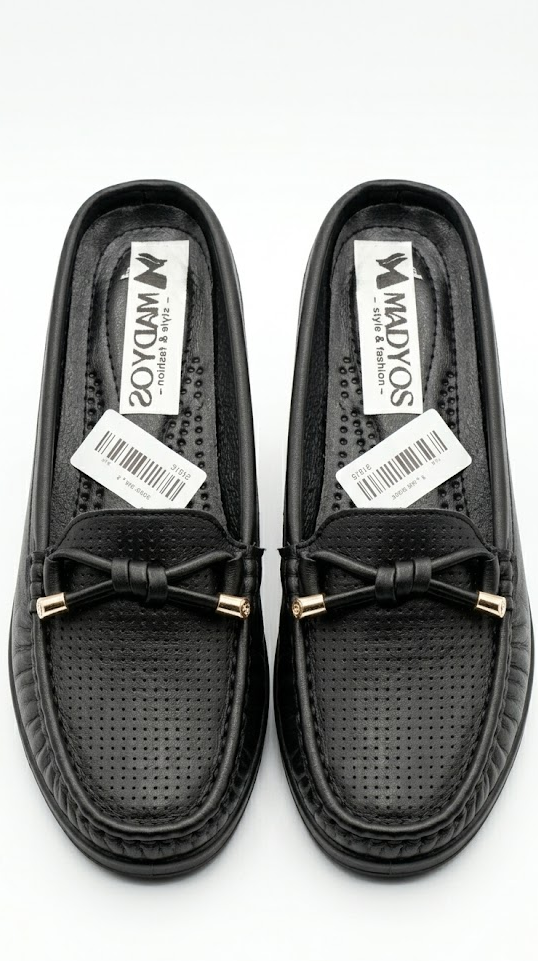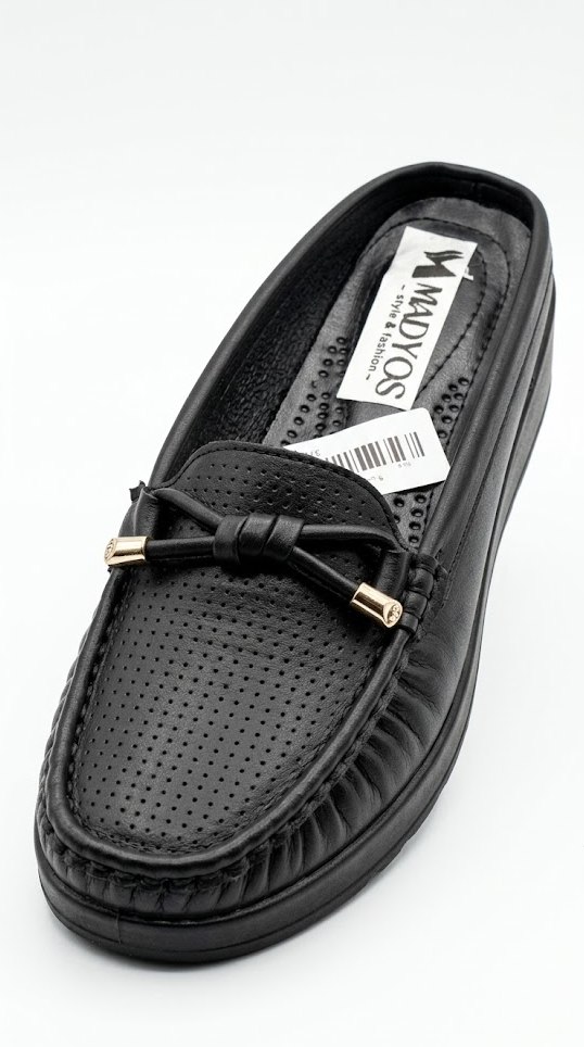 تصميم “Mule” عصري: سهل جداً في اللبس والقلع، بلمسة جمالية “فيونكة جلد” مع أطراف معدنية ذهبية بتديله شكل فخم “Premium”.