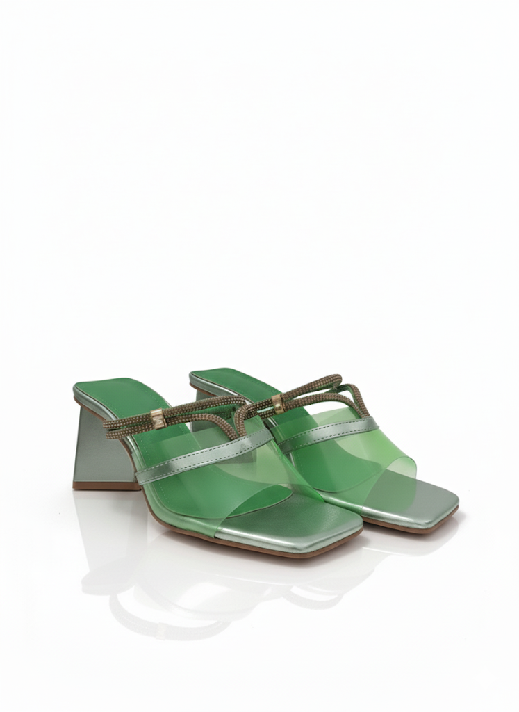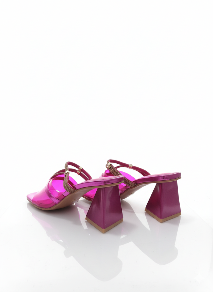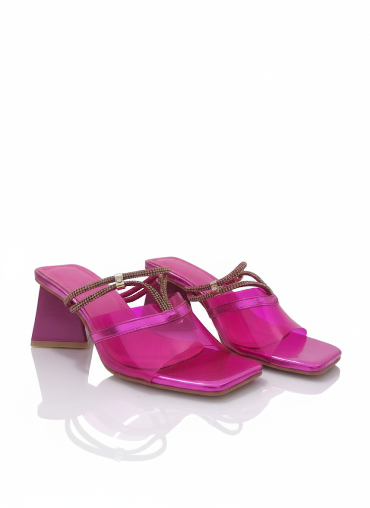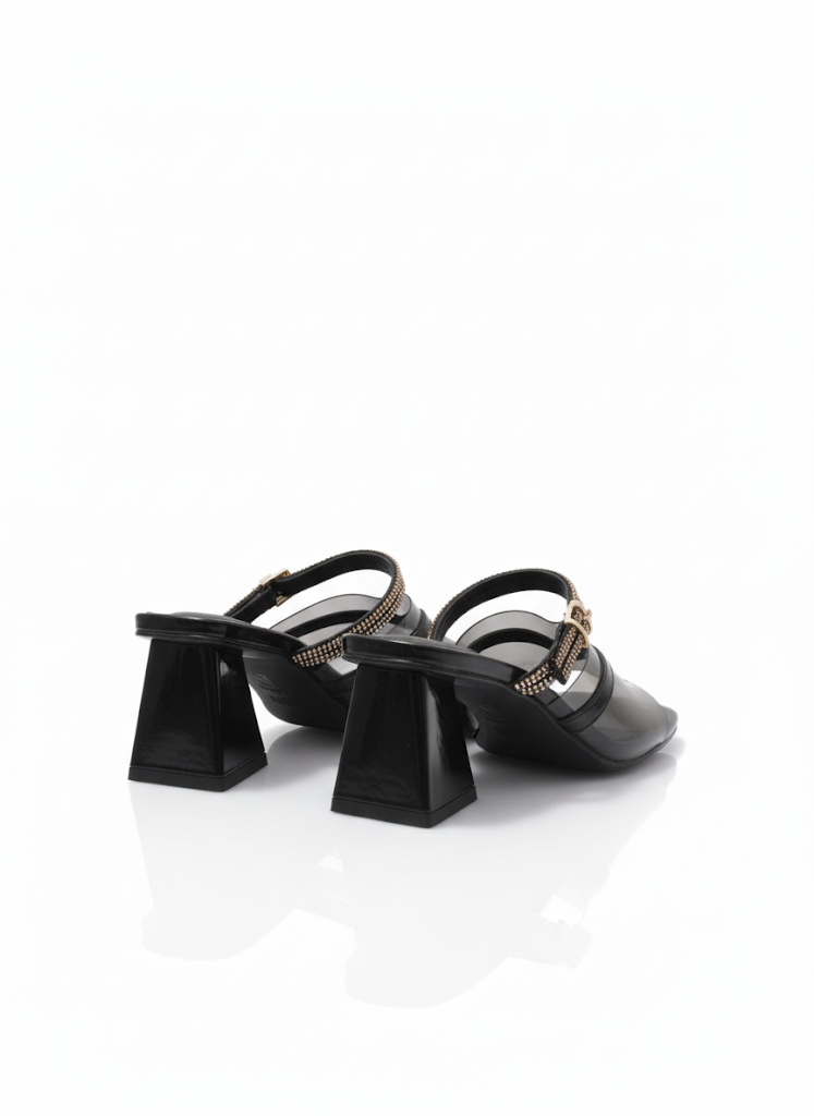 اخطُ نحو الأناقة العصرية مع هذا الشبشب الذي يجمع بين التصميم المبتكر والراحة الفائقة. يتميز هذا الحذاء بكعب عريض وهرمي الشكل، مما يمنحه مظهراً فريداً ويضمن لكِ الثبات عند كل خطوة. الجزء العلوي من الشبشب مصمم بأحزمة شفافة أو لامعة (حسب اللون) مزينة بخطوط من الترتر المتلألئ، مما يضيف لمسة من البريق والسحر إلى إطلالتك.