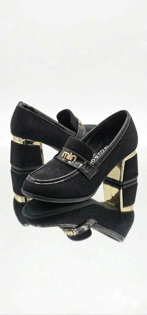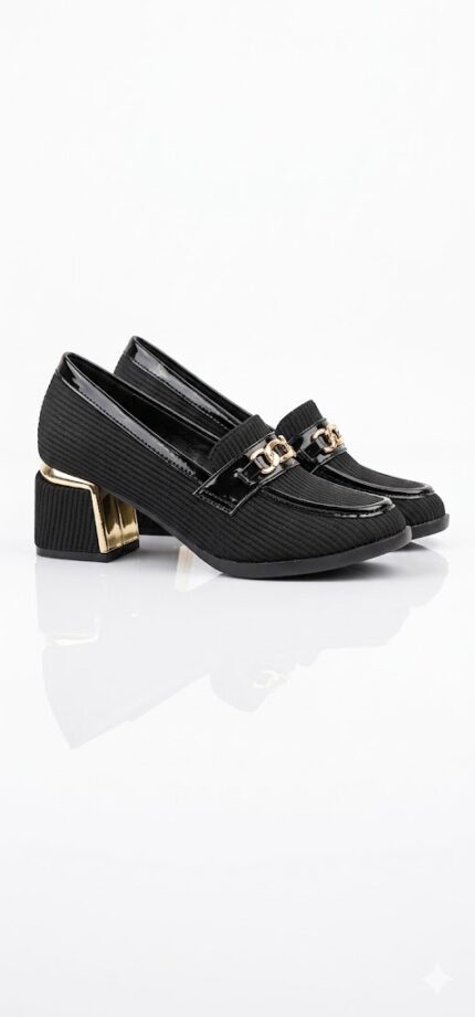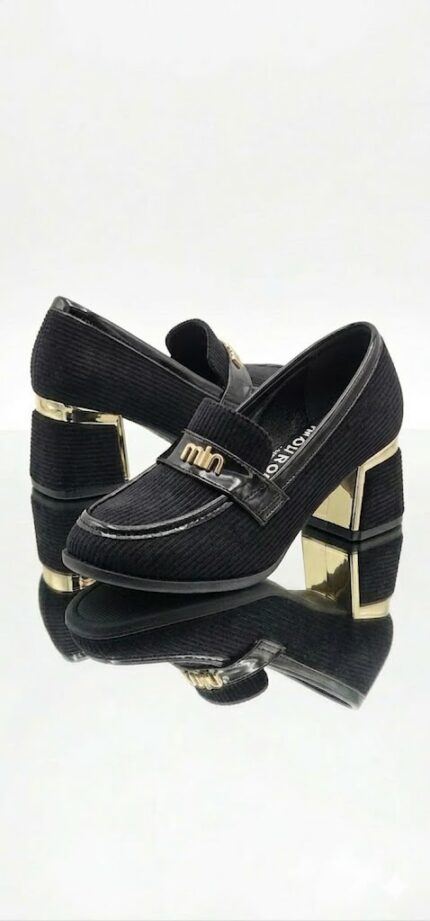 كعب بلوك ذهبي (Gold Block Heel): كعب عريض ومريح بارتفاع مثالي، مطلي باللون الذهبي اللامع ليمنحكِ طولاً وثقة وإطلالة خاطفة للأنظار.