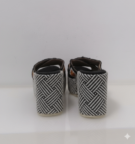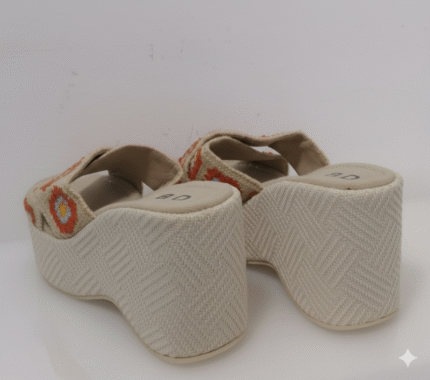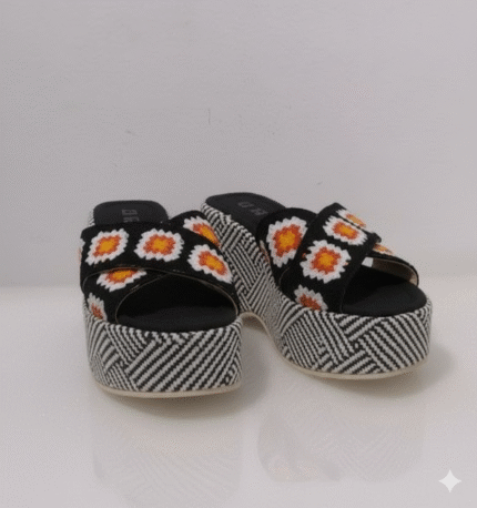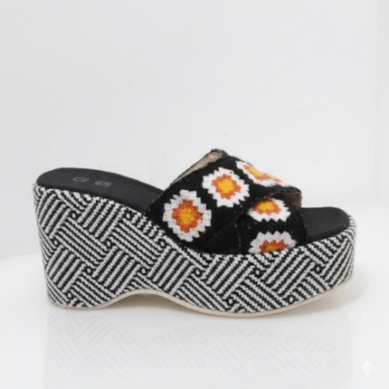 أبهري الجميع بجمال هذا الصندل البلاتفورم الفريد. يجمع بين الأناقة والراحة بتصميمه الجذاب المزخرف بزخارف زهرية ملونة (أبيض وبرتقالي) تضفي لمسة من الحيوية والمرح على قاعدته السوداء. الكعب العالي البلاتفورم يمنحك طولاً وثقة، بينما النقشة الهندسية بالأبيض والأسود على الكعب والقاعدة تضيف لمسة عصرية وجريئة.