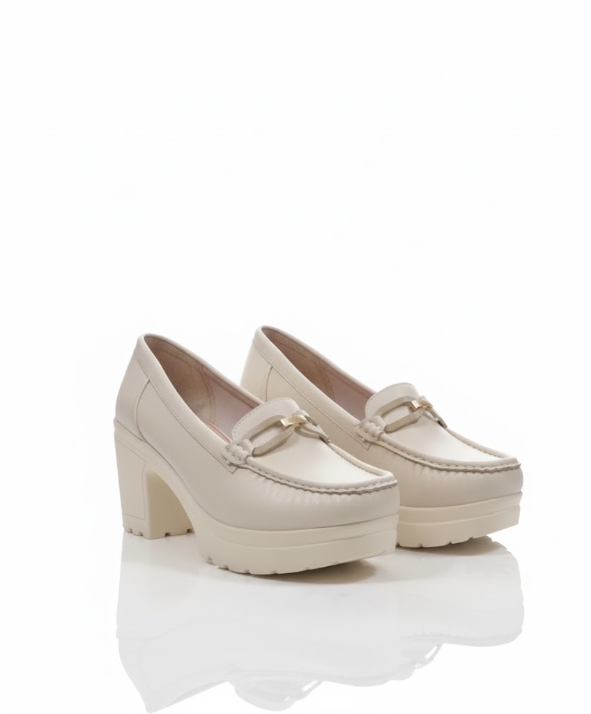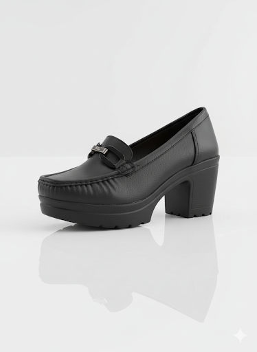 أناقة عملية وكلاسيكية. الحذاء ده بيجمع بين ستايل اللوفر العملي وكعب أنثوي عريض، وده بيخليه مناسب جداً للمرأة اللي بتبحث عن الأناقة والراحة في نفس الوقت. اللمسة المعدنية الفضية بتضيف له شكل شيك، وهو مثالي لإطلالة مكتبية أنيقة أو خروجة نهارية مريحة.